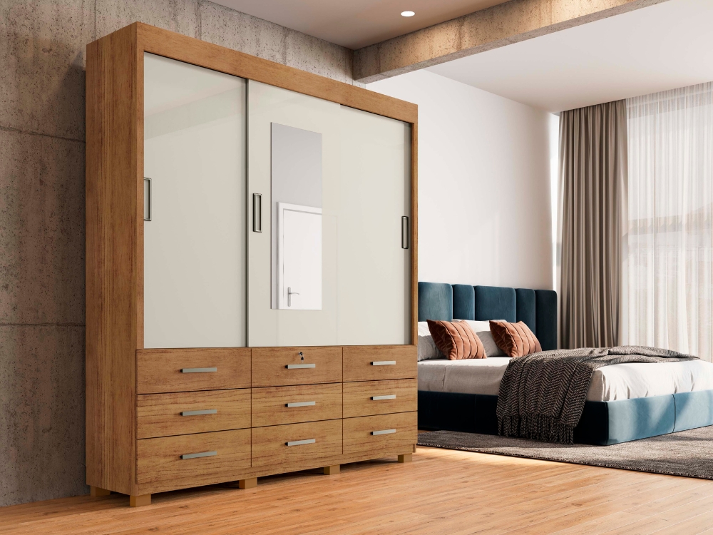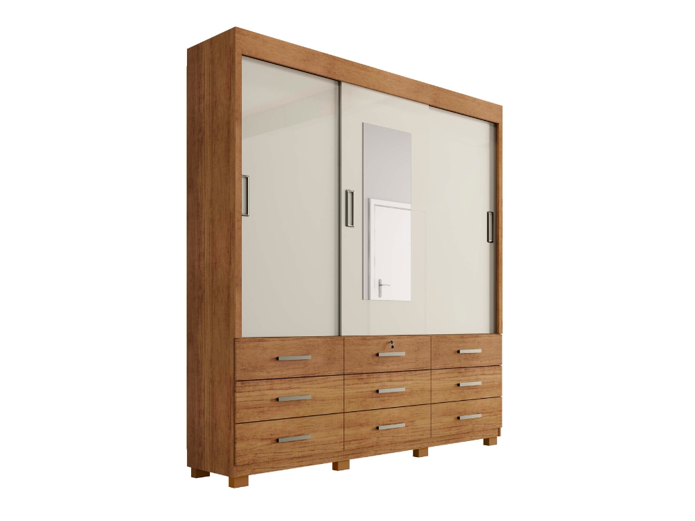 O Guarda Roupa Casal Itapema 3 Portas de Correr e 9 Gavetas com Espelho tem a característica principal de uso que dispõe de 9 gavetas grandes sendo uma com chave para maior privacidade, tendo acabamento a pintura texturizada dando a sensação real de madeira, o produto por ser porta de correr, tem o maior aproveitamento de espaço.
