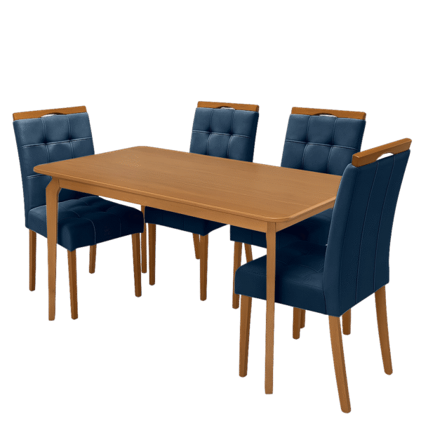 Mesa Alegra 120 Cinamomo com 4 Cadeiras Sophia Veludo Azul – JCM MOVELARIA + WM DECOR