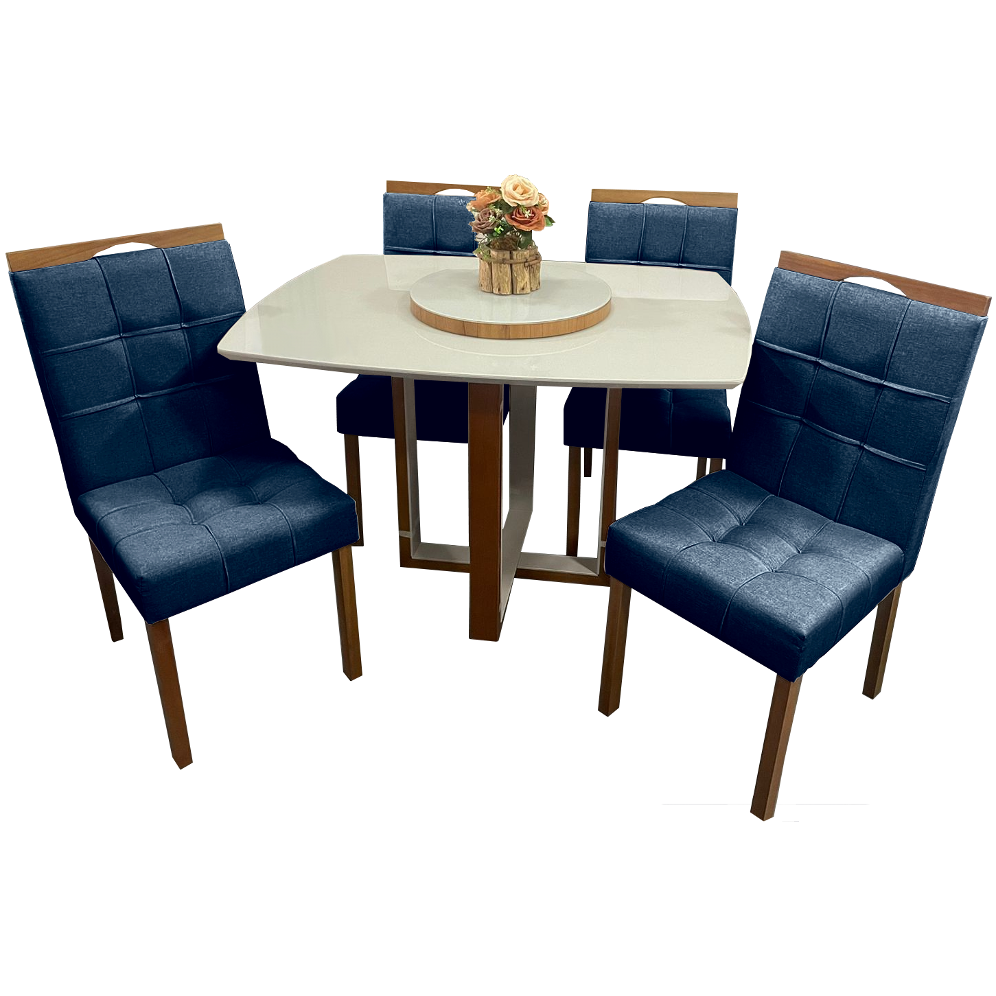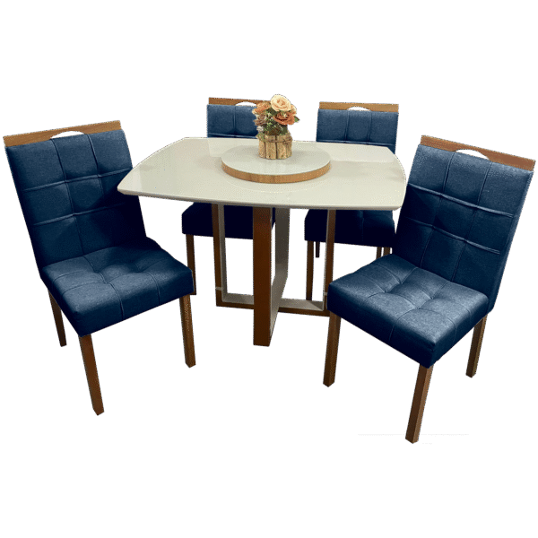 Mesa Atlas Mel/Off White Canto Barril 120×90 com 4 Cadeiras Sophia Mel/Veludo Azul – ART ASSENTOS + WM DECOR