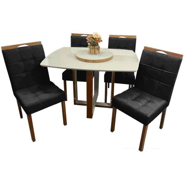 Mesa Atlas Mel/Off White Canto Barril 120×90 com 4 Cadeiras Sophia Mel/Veludo Preto – ART ASSENTOS + WM DECOR