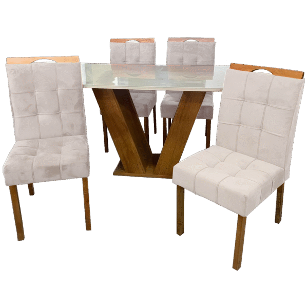 Mesa Classic 120 Cinamomo/Off White com 4 Cadeiras Sophia Mel/Veludo Bege – CEL MÓVEIS + WM DECOR