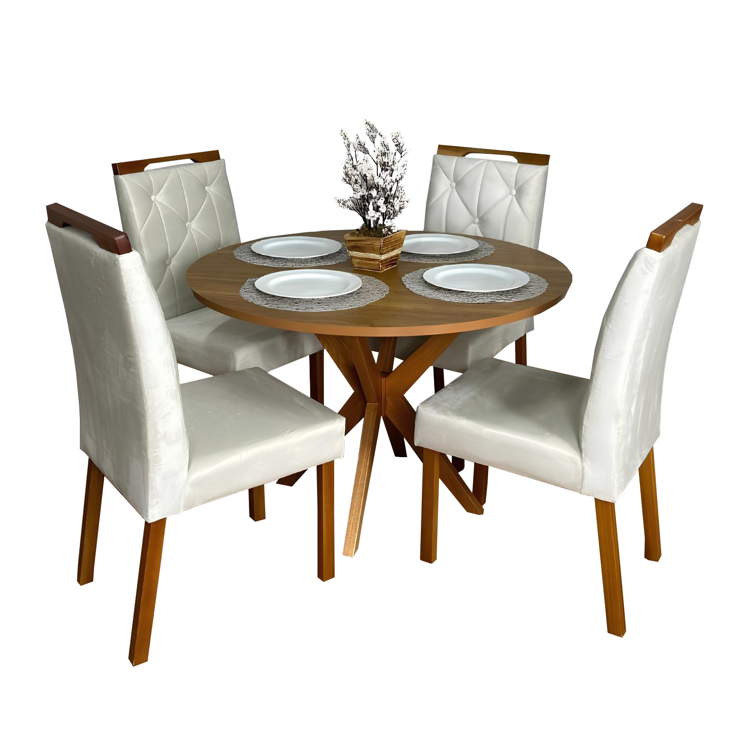 Mesa Redonda Simpatia 108 Cinamono com 4 Cadeiras Yasmim Veludo Bege – JCM MOVELARIA + KM DECOR