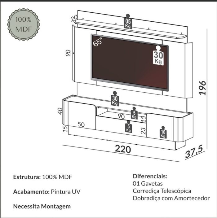 Painel + Rack até 65″ TB116L Off White/Freijó – DALLA COSTA