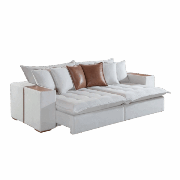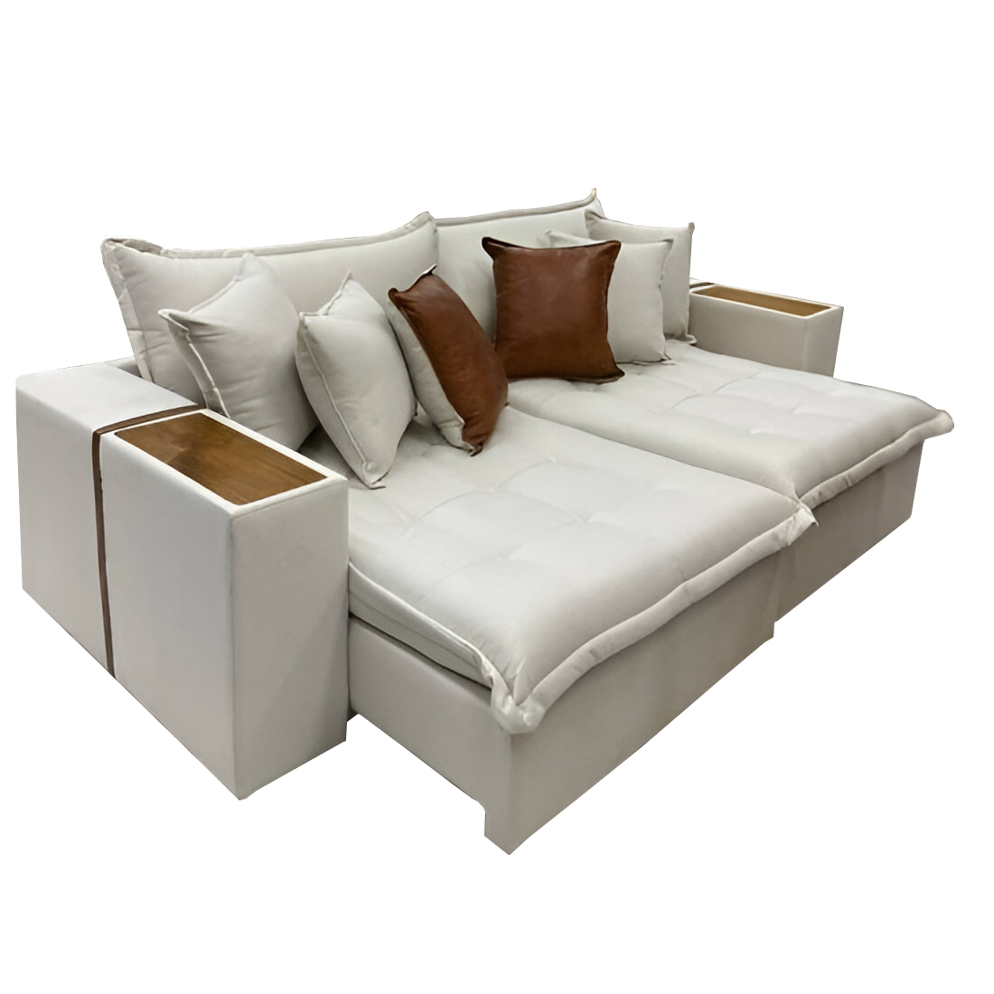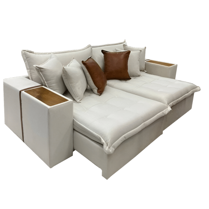 Sofá Cama Retrátil Tebas 2,95 m Linho Marfim 12/Courino Dallas 07 – INNOVE ESTOFADOS